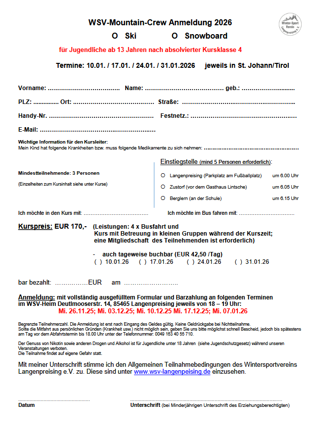 Voraussetzung für jeden Kursteilnehmer ist die Mitgliedschaft im Wintersportverein Langenpreising.